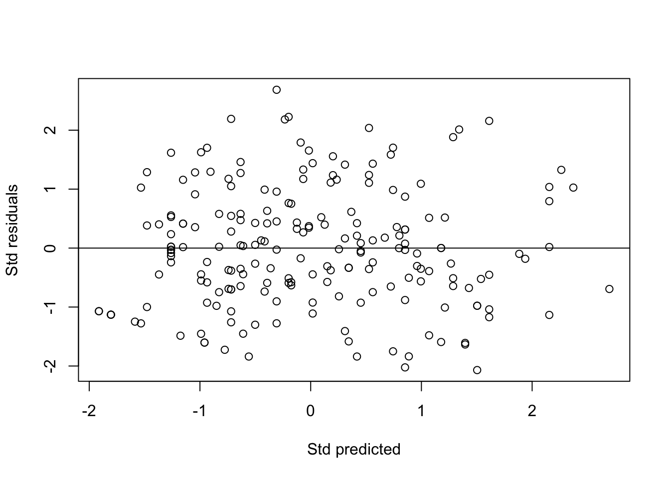 plot(rstd_chol ~ pstd_chol, xlab = "Std predicted", ylab = "Std residuals")