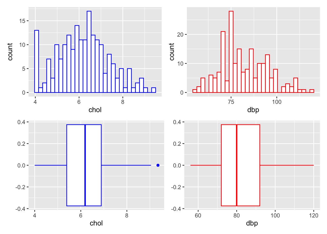 #> dbp 64.00 0.42 -0.33 0.91and the histograms and box-and-whiskers plots,