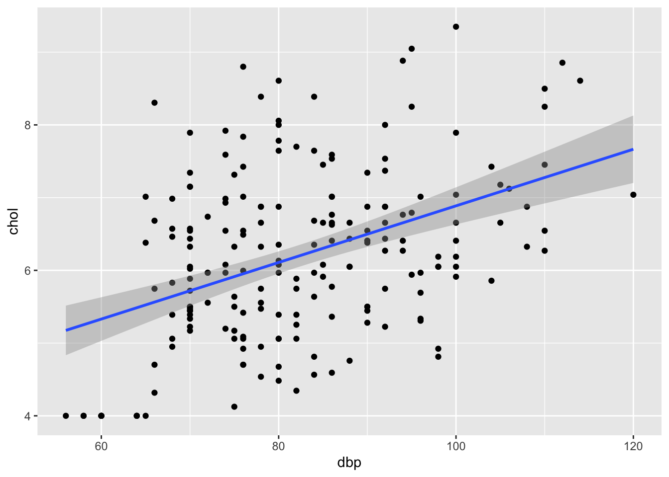 It is more useful to predict for newly observed data. Let us try predicting the cholesterol level for an Indian patient with DBP = 90mmHg,