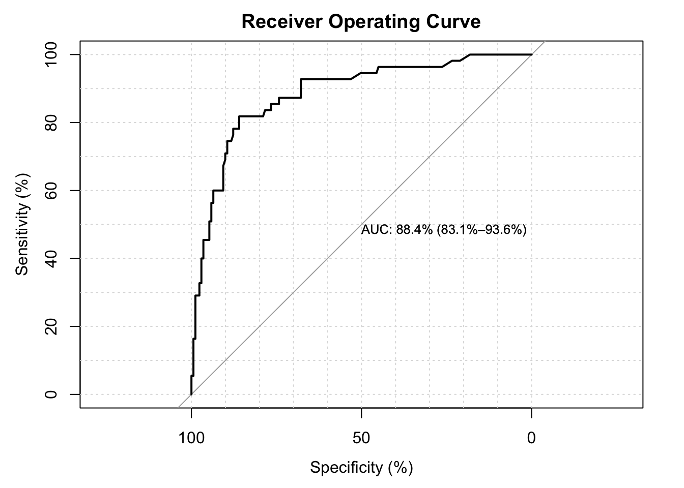 The area under the curve is \(87.2\%\). The values of above 80 are considered to have good discriminating effect.